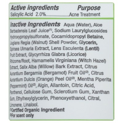 INGREDIENTS: Active Ingredients: Salicylic Acid (2.0 %), Acne Treatment. Inactive Ingredients: Aqua (Water), Aloe Barbadendsis Leaf Juice (Certified Organic Ingredient), Sodium Laurylglucosides Hydroxypropylsulfonate, Cocamidopropyl Betaine, Juglans Regia (Walnut) Shell Powder, Glycerin, Spiraea Ulmaria Extract, Lens Esculenta (Lentil) Fruit Extract, Glycyrrhiza Glabra (Licorice) Rhizome/Root, Hamamelis Virginiana (Witch Hazel) Extract, Salix Alba (Willow) Bark Extract, Citrus Aurantium Bergamia (Bergamot) Fruit Oil (For Scent Only), Citrus Aurantium Dulcis (Orange) Peel Oil (For Scent Only), Mentha Piperita (Peppermint) Oil (For Scent Only), Algin, Allantoin, Citric Acid, Panthenol, Cellulose Gum, Sclerotium Gum, Xanthan Gum, Ethylhexylglycerin, Phenoxyethanol, Citral, Limonene, Linalool.