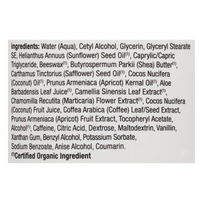 INGREDIENTS: Aqua (Purified Water), Cetyl Alcohol, Glycerin, Glyceryl Stearate SE, Helianthus Annuus (Sunflower) Seed Oil, Cocos Nucifera (Coconut) Oil (Certified Organic Ingredient), Hydrogenated Castor Oil, Ricinus Communis (Castor) Seed Oil, Camellia Sinensis Leaf Extract, Chamomilla Recutita (Matricaria) Flower Extract (Certified Organic Ingredient), Prunus Armeniaca (Apricot) Fruit Extract, Aloe Barbadensis Leaf Juice (Certified Organic Ingredient), Alcohol (Certified Organic Ingredient), Beeswax, Caffeine, Caprylic/Capric Triglyceride, Cocos Nucifera (Coconut) Fruit Juice, Copernicia Cerifera (Carnauba) Wax, Dextrose, Maltodextrin, Xanthan Gum, Vanillin, Benzyl Alcohol, Potassium Sorbate, Sodium Benzoate.