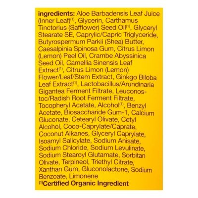 INGREDIENTS: Aloe Barbadensis Leaf Juice (Certified Organic Ingredient), Glycerin, Carthamus Tinctorius (Safflower) Seed Oil (Certified Organic Ingredient), Glyceryl Stearate SE, Caprylic/Capric Triglyceride, Butyrospermum Parkii (Shea) Butter, Crambe Abyssinica Seed Oil, Citrus Limon (Lemon) Peel Oil, Caesalpinia Spinosa Gum, Camilla Sinensis Leaf Extract (Certified Organic Ingredient), Ginkgo Biloba Leaf Extract (Certified Organic Ingredient), Lactobacillus/Arundinaria Gigantea Ferment Filtrate, Leuconostoc/Radish Root Ferment Filtrate, Tocopheryl Acetate, Biosaccharide Gum-1, Cetearyl Olivate, Cetyl Alcohol, Coco-Caprylate/Caprate, Coconut Alkanes, Sodium Chloride, Sodium Stearoyl Glutamate, Sorbitan Olivate, Xanthan Gum, Alcohol (Certified Organic Ingredient), Calcium Gluconate, Gluconolactone, Glyceryl Caprylate, Sodium Anisate, Sodium Benzoate, Sodium Levulinate, Benzyl Acetate, Isoamyl Salicylate, Terpineol, A-Terpinyl Acetate, Limonene.