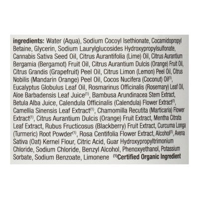 INGREDIENTS: Aqua (Water), Sodium Cocoyl Isethionate, Cocamidopropyl Betaine, Glycerin, Sodium Laurylglucosides Hydroxypropylsulfonate, Cannabis Sativa Seed Oil, Citrus Aurantifolia (Lime) Oil, Citrus Aurantium Bergamia (Bergamot) Fruit Oil, Citrus Aurantium Dulcis (Orange) Fruit Oil, Citrus Grandis (Grapefruit) Peel Oil, Citrus Limon (Lemon) Peel Oil, Citrus Nobilis (Mandarin Orange) Peel Oil, Cocos Nucifera (Coconut) Oil (Certified Organic Ingredient), Eucalyptus Globulus Leaf Oil, Rosmarinus Officinalis (Rosemary) Leaf Oil, Aloe Barbadensis Leaf Juice (Certified Organic Ingredient), Bambusa Arundinacea Stem Extract, Betula Alba Juice, Calendula Officinalis (Calendula) Flower Extract (Certified Organic Ingredient), Camellia Sinensis Leaf Extract (Certified Organic Ingredient), Chamomilla Recutita (Marticaria) Flower Extract (Certified Organic Ingredient), Citrus Aurantium Dulcis (Orange) Fruit Extract, Mentha Citrate Leaf Extract, Rubus Fructicosus (Blackberry) Fruit Extract, Curcuma Longa (Turmeric) Root Powder (Certified Organic Ingredient), Rosa Centifolia Flower Extract, Alcohol (Certified Organic Ingredient), Avena Sativa (Oat) Kernel Flour, Citric Acid, Guar Hydroxypropyltrimonium Chloride, Sodium Chloride, Benzyl Alcohol, Phenoxyethanol, Potassium Sorbate, Sodium Benzoate, Limonene.
