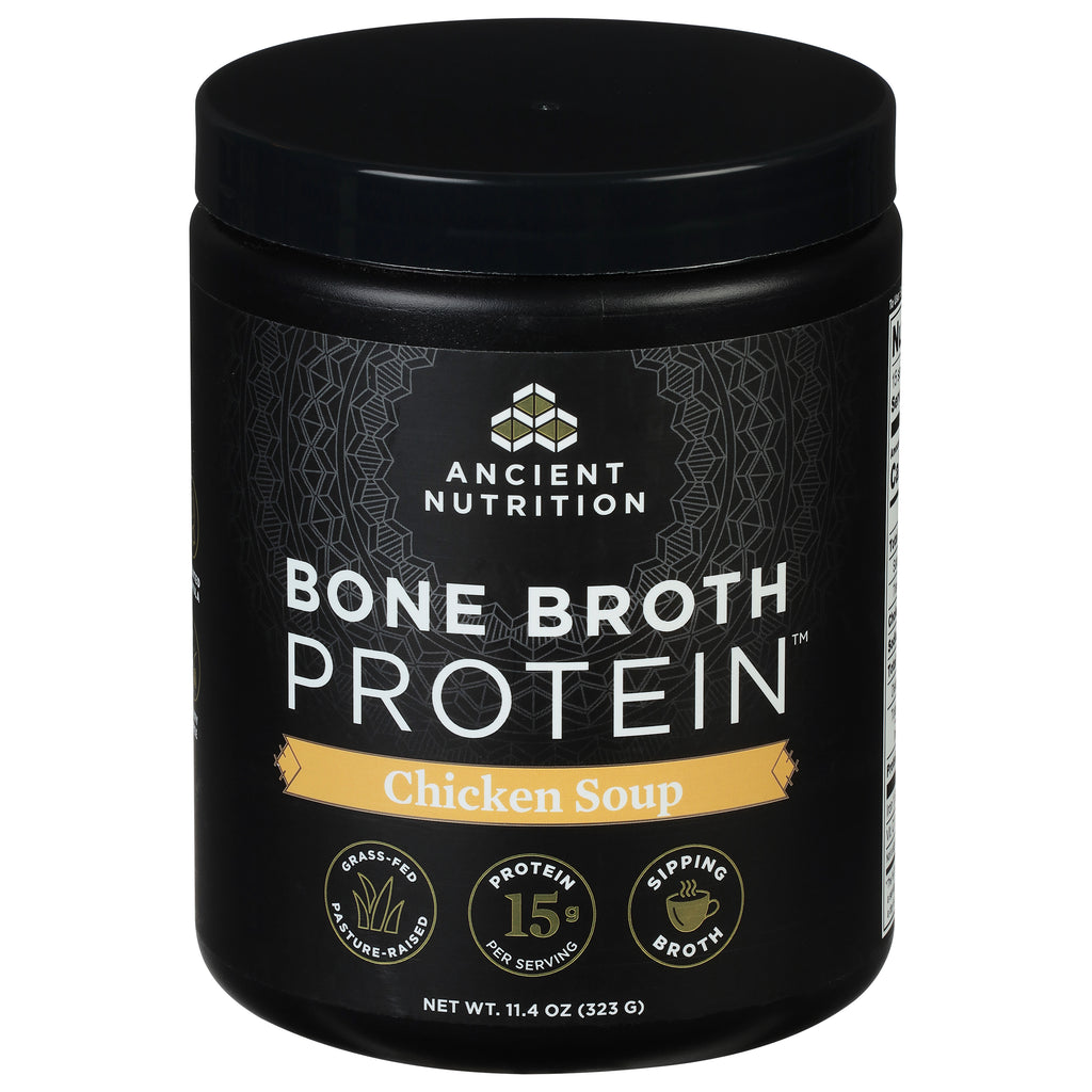 PRODUCT DETAILS: 15 g protein per serving. Dairy free. Grass-fed. Pasture-raised. Sipping broth. Color and odor may vary from lot to lot. Packaged by weight, not volume. Settling may occur. Ancient Nutrition has one goal-to transform the health of every individual on the planet with history's most powerful superfoods. Bone Broth Protein Chicken Soup is a nutrient-filled superfood packed with 15g of protein and makes the perfect sipping broth. This formula is made without common allergens. Patented formula. www.AncientNutrition.com. www.RanchProject.com. Facebook. Instagram. (at)ancientnutrition. Save the world with superfoods www.ancientnutrition.com. Ranch Project: We support the Ranch Project to heal the planet, feed the world and transform health. www.RanchProject.com.