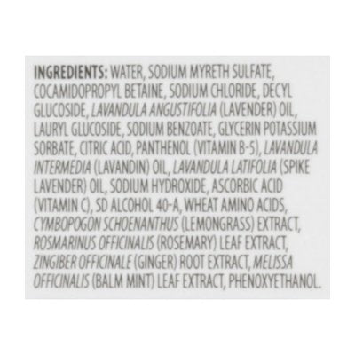 INGREDIENTS: Water, Sodium Myreth Sulfate, Cocamidopropyl Betain, Sodium Chloride, Decyl Glucoside, Lavandula Angustifolia (Lavender) Oil, Lauryl Glucoside, Sodium Benzoate, Glycerin Potassium Sorbate, Citric Acid, Panthenol (Vitamin B-5), Lavandula Intermedia (Lavandin) Oil, Lavandula Latifolia (Spike Lavender) Oil, Sodium Hydroxide, Ascorbic Acid (Vitamin C), SD Alcohol 40-a, Wheat Amino Acids, Cymbopogon Schoenanthus (Lemongrass) Extract, Rosmarinus Officinalis (Rosemary) Leaf Extract, Zingiber Officinale (Ginger) Root Extract, Melissa Officinalis (Balm Mint) Leaf Extract, Phenoxyethanol.