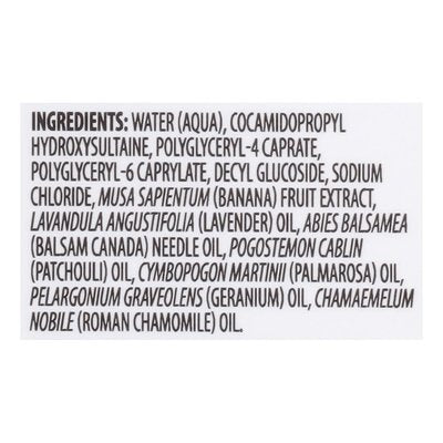 INGREDIENTS: Water (Aqua), Cocamidopropyl Hydroxysultaine, Polyglyceryl-4 Caprate, Polyglyceryl-6 Caprylate, Decyl Glucoside, Sodium Chloride, Musa Sapientum (Banana) Fruit Extract, Lavandula Angustifolia (Lavender) Oil, Abies Balsamea (Balsam Canada) Needle Oil, Pogostemon Cablin (Patchouli) Oil, Cymbogon Martinii (Palmarosa) Oil, Pelargonium Graveolens (Geranium) Oil, Chamaemelum Nobile (Roman Chamomile) Oil.
