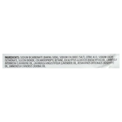 INGREDIENTS: Sodium Bicarbonate (Baking Soda), Sodium Chloride (Salt), Citric Acid, Sodium Cocoyl Isethionate, Silicon Dioxide, Cocamidopropyl Betaine, Eucalyptus Globulus (Eucalyptus) Oil, Lavandula Intermedia (Lavandin) Oil, Lavandula Angustifolia (Lavender) Oil, Rosmarinus Officinalis (Rosemary) Oil, Simmondsia Chinensis (Jojoba) Oil.