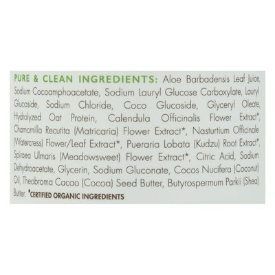 INGREDIENTS: Pure & Clean Ingredients: Aloe Barbadensis Leaf Juice, Sodium Cocoamphoacetate, Sodium Lauryl Glucose Carboxylate, Lauryl Glucoside, Sodium Chloride, Coco Glucoside, Glyceryl Oleate, Hydrolyzed Oat Protein, Calendula Officinalis Flower Extract (Certified Organic Ingredients), Chamomilla Recutita (Matricaria) Flower Extract (Certified Organic Ingredients), Nasturtium Officinale (Watercress) Flower/Leaf Extract (Certified Organic Ingredients), Pueraria Lobata (Kudzu) Root Extract (Certified Organic Ingredients), Spiraea Ulmaris (Meadowsweet) Flower Extract (Certified Organic Ingredients), Citric Acid, Sodium Dehydroacetate, Glycerin, Sodium Gluconate, Cocos Nucifera (Coconut) Oil, Theobroma Cacao (Cocoa) Seed Butter, Butyrospermum Parkii (Shea) Butter.