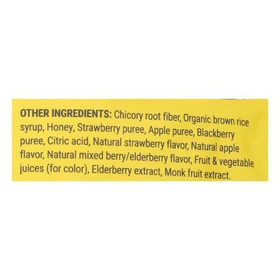 INGREDIENTS: Other Ingredients: Chicory Root Fiber, Organic Brown Rice Syrup, Honey, Strawberry Puree, Apple Puree, Blackberry Puree, Citric Acid, Natural Strawberry Flavor, Natural Apple Flavor, Natural Mixed Berry/Elderberry Flavor, Fruit & Vegetable Juices (for Color), Elderberry Extract, Monk Fruit Extract.