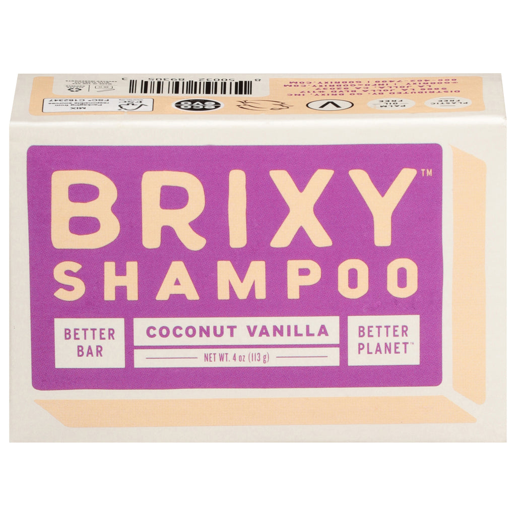 PRODUCT DETAILS: Vegan. Better bar. Better planet. Brixy bars are made for body care enthusiasts seeking plastic-free alternatives. Our bars offer such a luxuriously sudsy experience you won't miss your old bottle of shampoo! A comforting blend of indulgent coconut and vanilla. Formulated with coconut oil, argan oil, and provitamin B5 for strong and healthy looking hair. Free of palm oil, sulfates, phthalates, & parabens. Formulated for balance and hydration. pH balanced and safe for color treated hair. One Brixy bar lasts longer than two 8 oz bottles of body wash. gobrixy.com. 866-462-7499. Cruelty free. FSC: Mix - Packaging from responsible sources. www.fsc.org. Please recycle. Eco/evo world. Made in the USA with globally sourced ingredients.