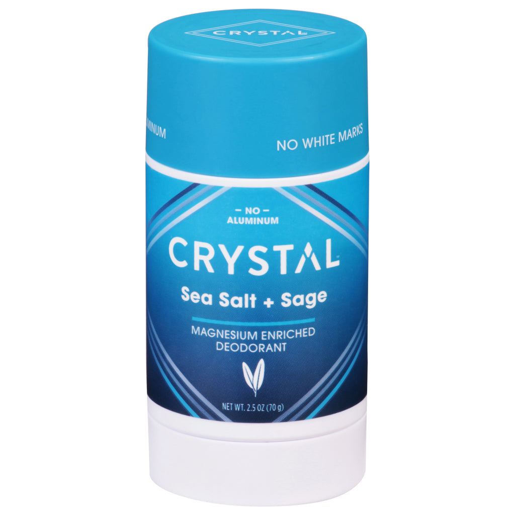PRODUCT DETAILS: Magnesium enriched deodorant. Vegan. No aluminum. No white marks. No baking soda. 24 hr odor protection. Dermatologist tested. No parabens. Essential oils. Hypoallergenic. Enhanced with the refreshing scent of Sea Salt and Sage. Magnesium enriched formula creates an invisible barrier to eliminate odor. Gentle, baking soda free formula glides on smooth, conditions and moisturizes. Non-sticky, non-staining and leaves no white residue. Prevents odor for up to 24 hours. thecrystal.com. Cruelty free.