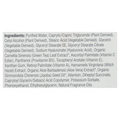 INGREDIENTS: Purified Water, Caprylic/Capric Triglyceride (Plant Derived), Cetyl Alcohol (Plant Derived), Stearic Acid (Vegetable Derived), Glycerin (Vegetable Derived), Glyceryl Stearate SE, Glyceryl Stearate Citrate (Vegetable Derived), Sodium Hyaluronate (Hyaluronic Acid), Organic Camellia Sinensis (Green Tea) Leaf Extract (Certified Organic Ingredients), Ascorbyl Palmitate (Vitamin C Ester), Panthenol (Provitamin B5), Tocopheryl Acetate (Vitamin E), Xanthan Gum, Retinyl Palmitate (Vitamin a), Hamamelis Virginiana (Witch Hazel) Extract, Organic Aloe Barbadensis (Aloe Vera) Extract (Certified Organic Ingredints), Organic Simmondsia Chinensis (Jojoba) Seed Oil (Certified Organic Ingredients), Allantoin, Diheptyl Succinate, Capryloyl Glycerin/Sebacic Acid Copolymer, Potassium Sorbate, Phenoxyethanol, Ethylhexylglycerin, Natural Fragrance Oils.