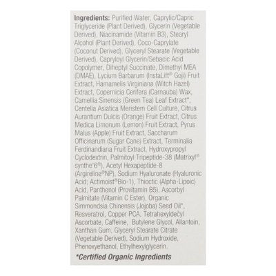 INGREDIENTS: Purified Water, Caprylic/Capric Triglyceride (Plant Derived), Glycerin (Vegetable Derived), Niacinamide (Vitamin B3), Stearyl Alcohol (Plant Derived), Coco-Caprylate (Coconut Derived), Glyceryl Stearate (Vegetable Derived), Capryloyl Glycerin/Sebacic Acid Copolymer, Diheptyl Succinate, Dimethyl MEA (Dmae), Lycium Barbarum (Instalift Goji) Fruit Extract, Hamamelis Virginiana (Witch Hazel) Extract, Copernicia Cerifera (Carnauba) Wax, Camellia Sinensis (Green Tea) Leaf Extract (Certified Organic Ingredients), Centella Asiatica Meristem Cell Culture, Citrus Aurantium Dulcis (Orange) Fruit Extract, Citrus Medica Limonum (Lemon) Fruit Extract, Pyrus Malus (Apple) Fruit Extract, Saccharum Officinarum (Sugar Cane) Extract, Terminalia Ferdinandiana Fruit Extract, Hydroxypropyl Cyclodextrin, Palmitoyl Tripeptide-38 (Matrixyl Synthe€™6), Acetyl Hexapeptide-8 (Argireline Np), Sodium Hyaluronate (Hyaluronic Acid, Actimoist Bio-1), Thioctic (Alpha-Lipoic) Acid, Panthenol (Provitamin B5), Ascorbyl Palmitate (Vitamin C Ester), Organic Simmondsia Chinensis (Jojoba) Seed Oil (Certified Organic Ingredients), Resveratrol, Copper PCA, Tetrahexyldecyl Ascorbate, Caffeine, Butylene Glycol, Allantoin, Xanthan Gum, Glyceryl Stearate Citrate (Vegetable Derived), Sodium Hydroxide, Phenoxyethanol, Ethylhexylglycerin.