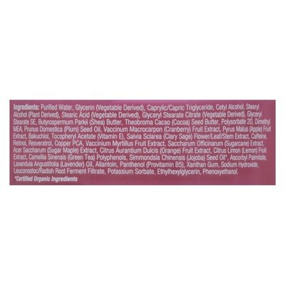 INGREDIENTS: Purified Water, Glycerin (Vegetable Derived), Caprylic/Capric Triglyceride, Cetyl Alcohol, Stearyl Alcohol (Plant Derived), Stearic Acid (Vegetable Derived), Glyceryl Stearate Citrate (Vegetable Derived), Glyceryl Stearate SE, Butyrospermum Parkii (Shea) Butter, Theobroma Cacao (Cocoa) Seed Butter, Polysorbate 20, Dimethyl MEA, Prunus Domestica (Plum) Seed Oil, Vaccinum Macrocarpon (Cranberry) Fruit Extract, Pyrus Malus (Apple) Fruit Extract, Bakuchiol, Tocopheryl Acetate (Vitamin E), Salvia Sclarea (Clary Sage) Flower/Leaf/Steam Extract, Caffeine, Retinol, Resveratrol, Copper PCA, Vaccinium Myrtillus Fruit Extract, Saccharum Officinarum (Sugarcane), Extract, Acer Saccharum (Sugar Maple) Extract, Citrus Aurantium Dulcis (Orange) Fruit Extract, Citrus Limon (Lemon) Fruit Extract, Camellia Sinensis (Green Tea) Polyphenols, Simmondsia Chinensis (Jojoba) Seed Oil (Certified Organic Ingredients), Ascorbyl Palmitate, C (Lavender) Oil, Allantoin, Panthenol (Provitamin B5), Xanthan Gum, Sodium Hydroxide, Leuconostoc/Radish Root Ferment Filtrate, Potassium Sorbate, Ethylhexylglycerin, Phenoxyethanol.