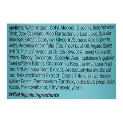 INGREDIENTS: Water (Aqua), Cetyl Alcohol, Glycerin, Behentrimonium Chloride, Coco-Caprylate, Aloe Barbadensis Leaf Juice, Salix Aloe (Willow) Bark Extract, Caprylol Glycerin/Sebacic Acid Copolymer, Menthol, Melaleuca Alternifolia (Tea Tree) Leaf Oil, Argania Spinosa Kernel Oil, Prunus Amygdalus Dulcis (Sweet Almond) Oil, Allantoin, Panthenol, Diheptyl Succinate, Salicyclic Acid, Epilobium Angustifolium Flower/Leaf/Stem Extract, Chamomilla Recutita (Matricaria) Flower Extract, Arctium Lappa Root Extract, Arctostaphylos Uva-Ursi Leaf Extract, Melia Azadirachta Extract, Coptis Trifolia Extract, Berberis Aquifolium Extract, Zanthoxylum Zanthoxyloides Bark Extract, Sodium Hydroxide, Phenoxyethanol, Ethylhexylglycerin.