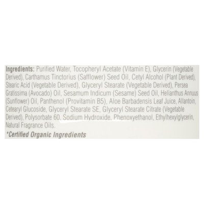INGREDIENTS: Purified Water, Tocopheryl Acetate (Vitamin E), Glycerin (Vegetable Derived), Carthamus Tinctorius (Safflower) Seed Oil, Cetyl Alcohol (Plant Derived), Stearic Acid (Vegetable Derived), Glyceryl Stearate (Vegetable Derived), Persea Gratissima (Avocado) Oil, Sesamum Indicum (Sesame) Seed Oil, Helianthus Annuus (Sunflower) Oil, Panthenol (Provitamin B5), Aloe Barbadensis Leaf Juice, Allantoin, Cetearyl Glucoside, Glyceryl Stearate SE, Glyceryl Stearate Citrate (Vegetable Derived), Polysorbate 60, Sodium Hydroxide, Phenoxyethanol, Ethylhexylglycerin, Natural Fragrance Oils.