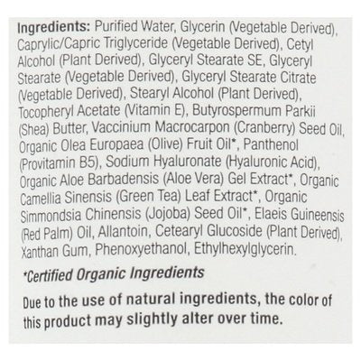 INGREDIENTS: Purified Water, Glycerin (Vegetable Derived), Caprylic/Capric Triglyceride (Vegetable Derived), Cetyl Alcohol (Plant Derived), Glyceryl Stearate SE, Glyceryl Stearate (Vegetable Derived), Glyceryl Stearate Citrate (Vegetable Derived), Stearyl Alcohol (Plant Derived), Tocopheryl Acetate (Vitamin E), Butyrospermum Parkii (Shea) Butter, Vaccinium Macrocarpon (Cranberry) Seed Oil, Organic Olea Europaea (Olive) Fruit Oil (Certified Organic Ingredients), Panthenol (Provitamin B5), Sodium Hyaluronate (Hyaluronic Acid), Organic Aloe Barbadensis (Aloe Vera) Gel Extract (Certified Organic Ingredients), Organic Camellia Sinensis (Green Tea) Leaf Extract (Certified Organic Ingredients), Organic Simmondsia Chinensis (Jojoba) Seed Oil (Certified Organic Ingredients), Elaeis Guineensis (Red Palm) Oil, Allantoin, Cetearyl Glucoside (Plant Derived), Xanthan Gum, Phenoxyethanol, Ethylhexylglycerin.