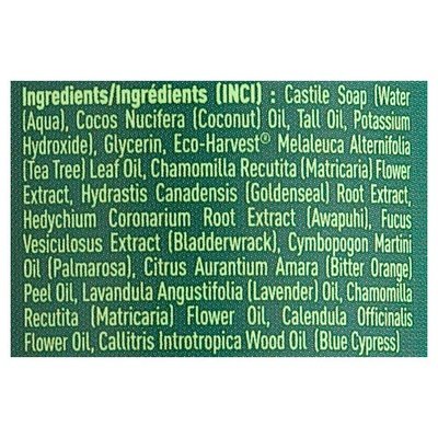 INGREDIENTS: Castile Soap (Water (Aqua), Cocos Nucifera (Coconut) Oil, Tall Oil, Potassium Hydroxide), Glycerin, Eco-Harvest Melaleuca Alternifolia (Tea Tree) Leaf Oil, Chamomilla Recutita (Matricaria) Flower Extract, Hydrastis Canadensis (Goldenseal) Root Extract, Hedychium Coronarium Root Extract (Awapuhi), Fucus Vesiculosus Extract (Bladderwrack), Cymbopogon Martini Oil (Palmarosa), Citrus Aurantium Amara (Bitter Orange) Peel Oil, Lavandula Angustifolia (Lavender) Oil, Chamomilla Recutita (Matricaria) Flower Oil, Calendula Offinalis Flower Oil, Callitris Introtropica Wood Oil (Blue Cypress).