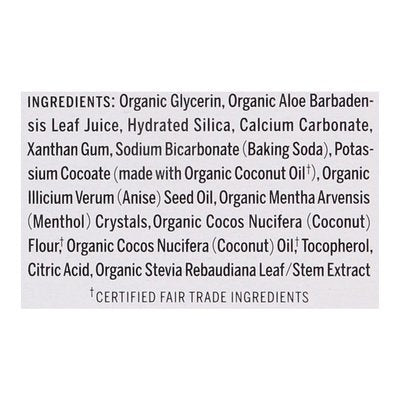 INGREDIENTS: Organic Glycerin, Organic Aloe Barbadensis Leaf Juice, Hydrated Silica, Calcium Carbonate, Xanthan Gum, Sodium Bicarbonate (Baking Soda), Potassium Cocoate (Made with Organic Coconut Oil (Certified Fair Trade Ingredients)), Organic Illicium Verum (Anise) Seed Oil, Organic Mentha Arvensis (Menthol) Crystals, Organic Cocos Nucifera (Coconut) Flour (Certified Fair Trade Ingredients), Organic Cocos Nucifera (Coconut) Oil (Certified Fair Trade Ingredients), Tocopherol, Citric Acid, Organic Stevia Rebaudiana Leaf/Stem Extract.