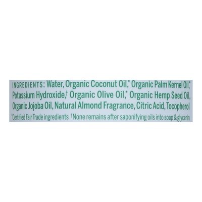 INGREDIENTS: Water, Organic Coconut Oil (Certified Fair Trade Ingredients), Organic Palm Kernel Oil (Certified Fair Trade Ingredients), Potassium Hydroxide (None Remains After Saponifying Oils Into Soap & Glycerin), Organic Olive Oil (Certified Fair Trade Ingredients), Organic Hemp Seed Oil, Organic Jojoba Oil, Natural Almond Fragrance, Citric Acid, Tocopherol.