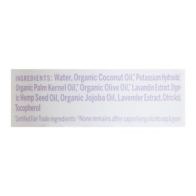 INGREDIENTS: Water, Organic Coconut Oil (Certified Fair Trade Ingredients), Potassium Hydroxide (None Remains After Saponifying Oils Into Soap and Glycerin), Organic Palm Kernel Oil (Certified Fair Trade Ingredients), Organic Olive Oil (Certified Fair Trade Ingredients), Lavandin Extract, Organic Hemp Oil, Organic Jojoba Oil, Lavender Extract, Citric Acid, Tocopherol.