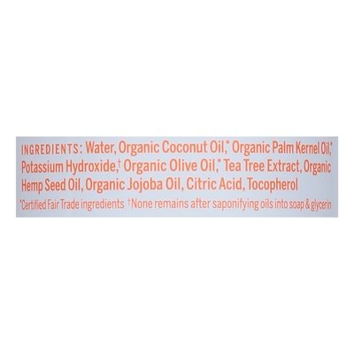 INGREDIENTS: Water, Organic Coconut Oil (Certified Fair Trade Ingredients), Potassium Hydroxide (None Remains After Saponifying Oils Into Soap and Glycerin), Organic Olive Oil (Certified Fair Trade Ingredients), Tea Tree Extract, Organic Hemp Seed Oil, Organic Jojoba Oil, Citric Acid, Tocopherol.