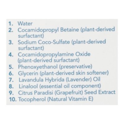 INGREDIENTS: Only 10 Ingredients 1, Water 2, Cocamidopropyl Betaine (Plant-Derived Surfactant) 3, Sodium Coco-Sulfate (Plant-Derived Surfactant) 4, Cocamidopropylamine Oxide (Plant-Derived Surfactant) 5, Phenoxyethanol (Preservative) 6, Glycerin (Plant-Derived Skin Softener) 7, Lavandula Hybrida (Lavender) Oil 8, Linalool (Essential Oil Component) 9, Citrus Paradisi (Grapefruit) Seed Extract 10, Tocopherol (Natural Vitamin E).