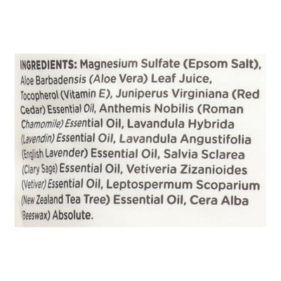 INGREDIENTS: Magnesium Sulfate (Epsom Salt), Aloe Barbadensis (Aloe Vera) Leaf Juice, Tocopherol (Vitamin E), Juniperus Virginiana (Red Cedar) Essential Oil, Anthemis Nobilis (Roman Chamomile) Essential Oil, Lavandula Hybrida (Lavendin) Essential Oil, Lavandula Angustifolia (English Lavender) Essential Oil, Salvia Sclarea (Clary Sage) Essential Oil, Vetiveria Zizanioides (Vetiver) Essential Oil, Leptospermum Scoparium (New Zealand Tea Tree) Essential Oil, Cera Alba (Beeswax) Absolute.
