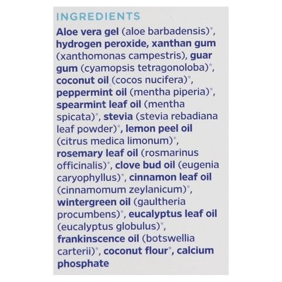 INGREDIENTS: Aloe Vera Gel (Aloe Barbadensis) (Organic Ingredient), Hydrogen Peroxide, Xanthan Gum (Xanthomonas Campestris), Guar Gum (Cyamopsis Tetragonolba) (Organic Ingredient), Coconut Oil (Cocos Nucifera) (Organic Ingredient), Peppermint Oil (Mentha Piperia) (Organic Ingredient), Spearmint Leaf Oil (Mentha Spicata) (Organic Ingredient), Stevia (Stevia Rebadiana Leaf Powder) (Organic Ingredient), Lemon Peel Oil (Citrus Medica Limonum) (Organic Ingredient), Rosemary Leaf Oil (Rosmarinus Officinalis) (Organic Ingredient), Clove Bud Oil (Eugenia Caryophyllus) (Organic Ingredient), Cinnamon Leaf Oil (Cinnamomum Zeylanicum) (Organic Ingredient), Wintergreen Oil (Gaultheria Procumbens) (Organic Ingredient), Eucalyptus Leaf Oil (Eucalyptus Globulus) (Organic Ingredient), Frankinscence Oil (Botswellia Carterii) (Organic Ingredient), Coconut Flour (Organic Ingredient), Calcium Phosphate.