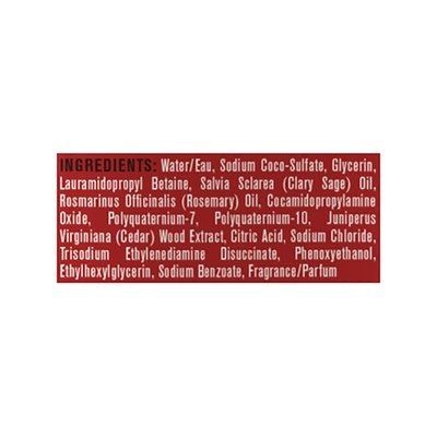 INGREDIENTS: Aqua/Water/Eau, Sodium Coco-Sulfate, Glycerin, Lauramidopropyl Betaine, Cocamidopropylamine Oxide, Salvia Sclarea (Clary Sage) Oil, Rosmarinus Officinalis (Rosemary) Oil, Polyquaternium-7, Polyquaternium-10, Juniperus Virginiana Wood Extract, PEG-40 Hydrogenated Castor Oil, Citric Acid, Ethylhexylglycerin, Phenoxyethanol, Sodium Benzoate, Potassium Sorbate, Linalool, Fragrance/Parfum, Hexyl Cinnamic Aldehyde, Linalool.