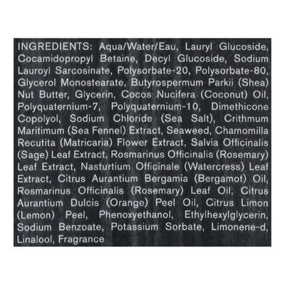 INGREDIENTS: Aqua/Water/Eau, Lauryl Glucoside, Cocamidopropyl Betaine, Decyl Glucoside, Sodium Lauroyl Sarcosinate, Polysorbate-20, Polysorbate-80, Glycerol Monostearate, Butyrospermum Parkii (Shea) Nut Butter, Glycerin, Cocos Nucifera (Coconut) Oil, Polyquaternium-7, Polyquaternium-10, Dimethicone Copolyol, Sodium Chloride (Sea Salt), Crithmum Maritimum (Sea Fennel) Extract, Seaweed, Chamomilla Recutita (Matricaria) Flower Extract, Salvia Officinalis (Sage) Leaf Extract, Rosmarinus Officinalis (Rosemary) Leaf Extract, Nasturtium Officinale (Watercress) Leaf Extract, Citrus Aurantium Bergamia (Bergamot) Oil, Rosmarinus Officinalis (Rosemary) Leaf Oil, Citrus Aurantium Dulcis (Orange) Peel Oil, Citrus Limon (Lemon) Peel, Phenoxyethanol, Ethylhexylglycerin, Sodium Benzoate, Potassium Sorbate, Limonene-D, Linalool, Fragrance.