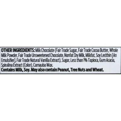 INGREDIENTS: Sleep Blend: Chamomile Flower Extract, Melatonin (2 mg). Other Ingredients: Milk Chocolate (Fair Trade Sugar, Fair Trade Cocoa Butter, Whole Milk Powder, Fair Trade Unsweetened Chocolate, Nonfat Dry Milk, Milkfat, Soy Lecithin [an Emulsifier], Fair Trade Natural Vanilla Extract), Sugar, Less than 1% Tapioca, Gum Acacia, Spirulina Extract (Color), Carnauba Wax.