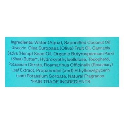 INGREDIENTS: Water (Aqua), Saponified Coconut Oil, Glycerin, Olea Europaea (Olive) Fruit Oil, Cannabis Sativa (Hemp) Seed Oil, Organic Butyrospermum Parkii (Shea) Butter (Fair Trade Ingredients), Hydroxyethylcellulose, Tocopherol, Potassium Citrate, Rosmarinus Officinalis (Rosemary) Leaf Extract, Propanediol (and) Ethylhexylglycerin (and) Potassium Sorbate, Natural Fragrance.