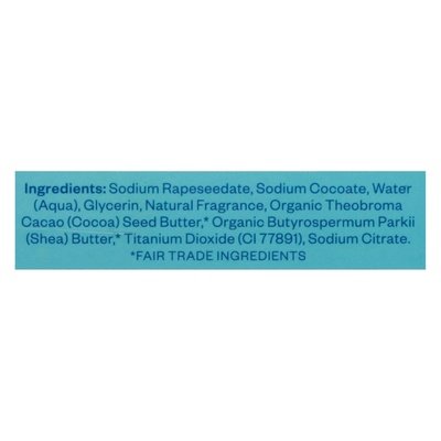 DESCRIPTION: Sweet mint & eucalyptus. Vegan. Sustainable suds. Natural soap. Palm oil free. 99% natural. No palm oil. No parabens. No phthalates. No sls/sles. No bht. No edta. No pegs. Buy a bar give a bar. For every product purchased, hand in hand donates one bar of soap and one month of clean water to a child in need. handinhandsoap.com. Cruelty free. Made in the USA. < Sodium Rapeseedate, Sodium Cocoate, Water (Aqua), Glycerin, Natural Fragrance Organic Theobroma Cacao (Cocoa) Seed Butter, (Fair Trade Ingredients) Organic Butyrospermum Parkii (Shea) Butter, (Fair Trade Ingredients) Titanium Dioxide (CI 77891), Sodium Citrate.