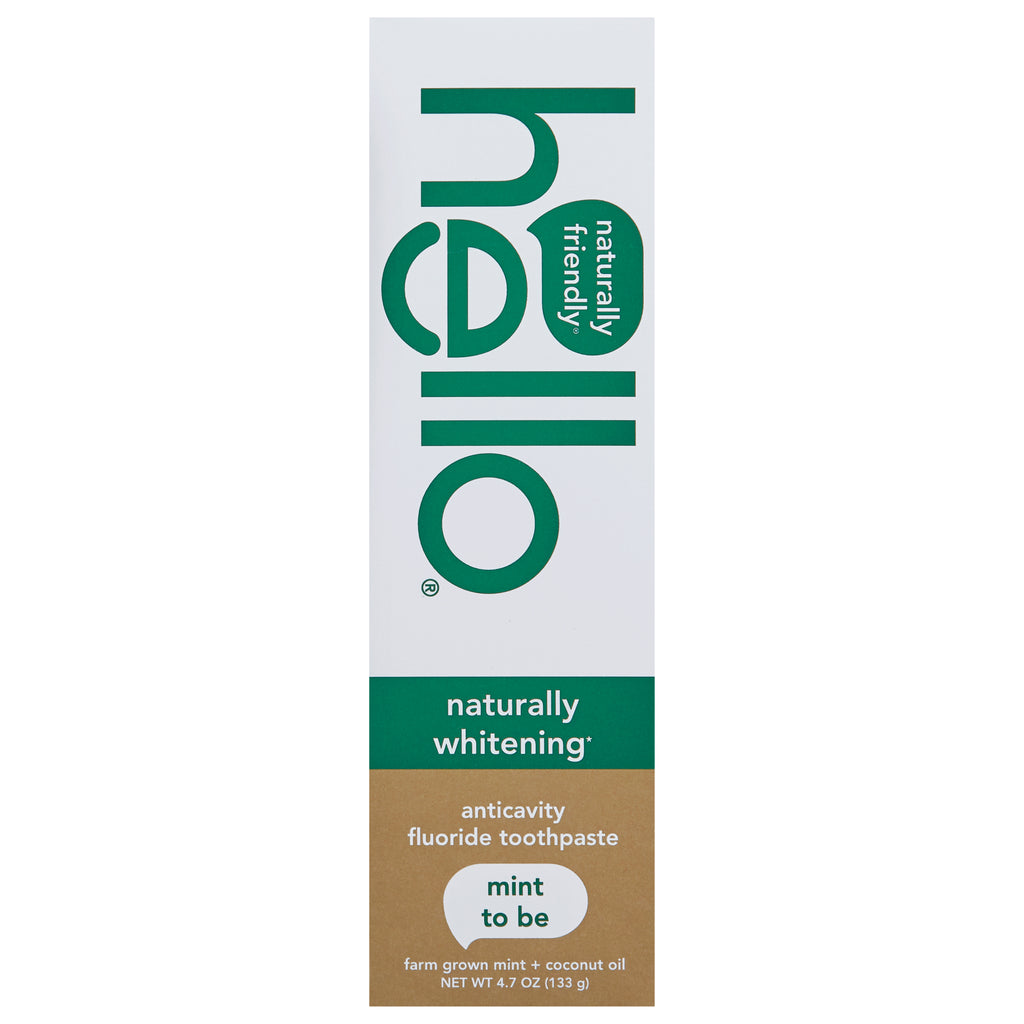 PRODUCT DETAILS: Anticavity flouride toothpaste. No artificial sweeteners/flavors, no dyes, no SLS/sulfates, no titanium dioxide, no brainer. Vegan. Naturally friendly. Naturally whitening (with natural whitening ingredients to remove surface stains). Farm grown mint + coconut oil. Awesome fresh breath. Say hello to a naturally whitening paste the tastes awesome and works brilliantly with a calcium mineral blend that helps naturally whiten teeth by removing surface stains. It's thoughtfully formulated to tame bad breath and moisturize. Bonus: It includes farm grown super-peppy peppermint, tea tree oil, and coconut oil for extra friendliness. Whitens naturally freshens breath. Whitens naturally. Prevents cavities. Strengthens enamel. Mind-blowing freshness. helloproducts.com. (hashtag)brushhappy. Questions? 855-Hi-Hello (1-855-444-3556). Leaping bunny certified. Not tested on animals. This carton is recyclable + printed with soy inks. Sweet, a recyclable tube! But first, be sure to check locally: your community may not accept tubes for recycling just yet. Learn more at helloproducts.com. FSC: Mix - packaging - supporting responsible forestry. Printed with soy ink. Globally sourced ingredients + made in the USA. Rock on.