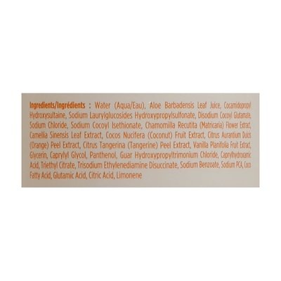 INGREDIENTS: Water (Aqua), Aloe Barbadensis Leaf Juice, Cocamidopropy Hydroxysultaine, Sodium Laurylglucosides Hydroxypropylsulfonate, Disodium Cocoyl Glutamate, Sodium Chloride, Sodium Cocoyl Isethionate, Chamomilla Recutita (Matricaria) Flower Extract, Camellia Sinensis Leaf Extract, Cocos Nucifera (Coconut) Fruit Extract, Citrus Aurantium Dulis (Orange) Peel Extract, Citrus Tangerina (Tangerine) Peel Extract, Vanilla Planifolia Fruit Extract, Gycerin, Caprylyl Glycol, Panthenol, Guar Hydroxypropyltrimonium Chloride, Caprylhydroxamc Acid, Triethyl Citrate, Trisodium Ethylenediamine Disuccinate, Sodium Benzoate, Sodium PCA, Coco Fatty Acid, Glutamic Acid, Citric Acid, Limonene.