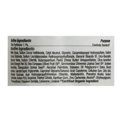 INGREDIENTS: Active Ingredients: Zinc Pyrithione (1.0%). Purpose: Controls Dandruff. Inactive Ingredients: Aqua (Water), Lauryl Glucoside, Glycerin, Sodium Coco-Sulfate, Sodium Cocoyl Isethionate, Glycol Stearate, Olea Europaea (Olive) Fruit Oil (Certified Organic Ingredient), Simmondsia Chinensis (Jojoba) Seed Oil (Certified Organic Ingredient), Babassu Oil Polyglyceryl-4 Esters, Cetyl Alcohol, Coco-Glucoside, Hydrolyzed Wheat Protein, Glyceryl Oleate, Magnesium Sulfate, Polyquaternium-10, Sodium PCA, Sodium Sulfate, Zinc Carbonate, Benzyl Alcohol, Alpha-Isomethyl Ionone, Butylphenyl Methylpropional, Fragrance (Parfum).