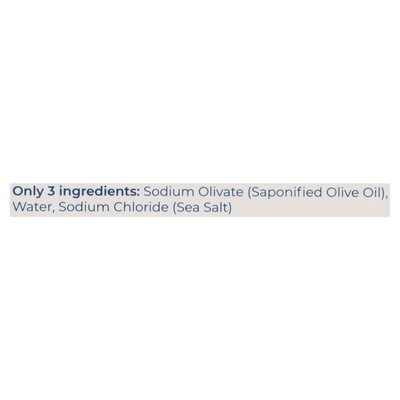 INGREDIENTS: Only 3 Ingredients: Sodium Olivate (Saponified Olive Oil), Water, Sodium Chloride (Sea Salt).