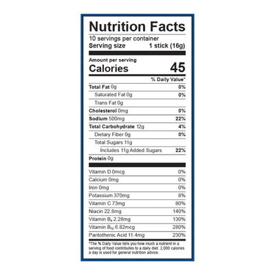 INGREDIENTS: Pure Cane Sugar, Dextrose, Citric Acid, Salt, Potassium Citrate, Sodium Citrate, Dipotassium Phosphate, Silicon Dioxide, Rebaudioside-A (Stevia Leaf Extract), Natural Flavors, Vitamin C (Ascorbic Acid), Vitamin B3 (Niacinamide), Vitamin B5 (D-Calcium Pantothenate), Vitamin B6 (Pyridoxine Hydrochloride), Vitamin B12 (Cyanocobalamin).