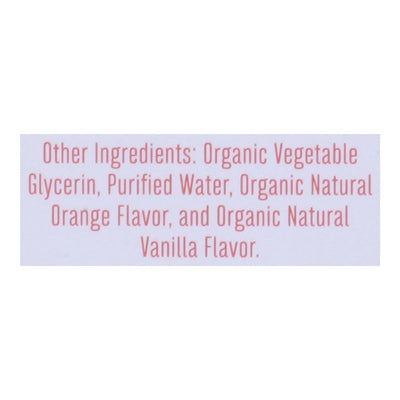 INGREDIENTS: Other Ingredients: Organic Vegetable Glycerin, Purified Water, Organic Natural Orange Flavor, and Organic Natural Vanilla Flavor.