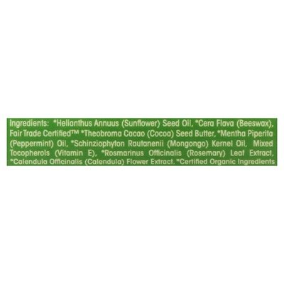 INGREDIENTS: Helianthus Annuus (Sunflower) Seed Oil (Certified Organic Ingredients), Cera Flava (Beeswax) (Certified Organic Ingredients), Fair Trade Certified Theobroma Cacao (Cocoa) Seed Butter (Certified Organic Ingredients), Mentha Piperita (Peppermint) Oil (Certified Organic Ingredients), Schinziophyton Rautanenii (Mongongo) Kernel Oil (Certified Organic Ingredients), Mixed Tocopherols (Vitamin E), Rosmarinus Officinalis (Rosemary) Leaf Extract (Certified Organic Ingredients), Calendula Officinalis (Calendula) Flower Extract (Certified Organic Ingredients).