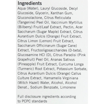 INGREDIENTS: Aqua (Water), Lauryl Glucoside, Decyl Glucoside, Glycerin, Xanthan Gum, Gluconolactone, Citrus Reticulata (Tangerine) Peel Oil, Vaccinium Myrtillus (Bilberry) Fruit/Leaf Extract, Pectin, Acer Saccharum (Sugar Maple) Extract, Citrus Aurantium Dulcis (Orange) Fruit Extract, Citrus Limon (Lemon) Fruit Extract, Saccharum Officinarum (Sugar Cane) Extract, Fructooligosaccharides (D-Beta), Glucosamine HCl (D), Citrus Paradisi (Pink Grapefruit) Peel Oil, Ananas Sativus (Pineapple) Fruit Extract, Potassium Sorbate, Citrus Aurantium Dulcis (Orange) Callus Culture Extract, Hamamelis Virginiana (Witch Hazel) Water, Alcohol, Alcohol Denat., Sodium Benzoate, Limonene.