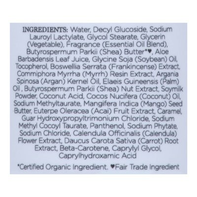 INGREDIENTS: Cocamidopropyl Betaine (Coconut Oil Soap), Ammonium Lauryl Sulfate (Palm Kernel Soap), Sodium Lauroyl Lactylate (Palm Kernel), Glycol Stearate (Palm Kernel), Stearamide AMP (Palm Kernel), Deionized Water, Raw Butyrospermum Parkii (Shea) Butter (Certified Organic Ingredient), Essential Oil Blend, Tocopherol (Vitamin E), Panthenol (Vitamin B-5), Sodium Lauroyl Hydrolyzed Silk (Silk Proteins), Soy Milk, Guar Hydroxypropyltrimonium Chloride, Lonicera Caprifolium (Honeysuckle) Flower (and) Lonicera Japonica (Japanese Honeysuckle) Flower Extract.
