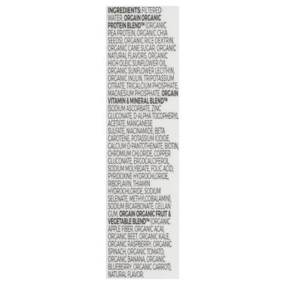 INGREDIENTS: Filtered Water, Orgain Organic Protein Blend (Organic Pea Protein, Organic Chia Seeds), Organic Rice Dextrin, Organic Cane Sugar, Organic Natural Flavors, Organic High Oleic Sunflower Oil, Organic Sunflower Lecithin, Organic Inulin, Tripotassium Citrate, Tricalcium Phosphate, Magnesium Phosphate, Orgain Vitamin & Mineral Blend (Sodium Ascorbate, Zinc Gluconate, D-Alpha Tocopheryl Acetate, Manganese Sulfate, Niacinamide, Beta Carotene, Potassium Iodide, Calcium-D-Pantothenate, Biotin, Chromium Chloride, Copper Gluconate, Ergocalciferol, Sodium Molybdate, Folic Acid, Pyridoxine Hydrochloride, Riboflavin, Thiamin Hydrochloride, Sodium Selenate, Methylcobalamin), Sodium Bicarbonate, Gellan Gum, Orgain Organic Fruit & Vegetable Blend (Organic Apple Fiber, Organic Acai, Organic Beet, Organic Kale, Organic Raspberry, Organic Spinach, Organic Tomato, Organic Banana, Organic Blueberry, Organic Carrot), Natural Flavor.