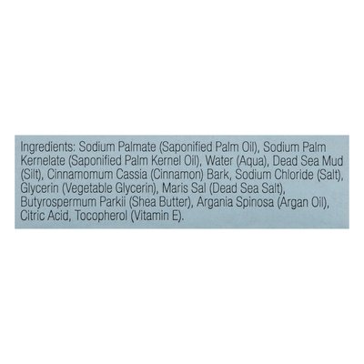 INGREDIENTS: Sodium Palmate (Saponified Palm Oil), Sodium Palm Kernelate (Saponified Palm Kernel Oil), Water (Aqua), Dead Sea Mud (Silt), Cinnamomum Cassia (Cinnamon) Bark, Sodium Chloride (Salt), Glycerin (Vegetable Glycerin), Maris Sal (Dead Sea Salt), Butyrospermum Parkii (Shea Butter), Argania Spinosa (Argan Oil), Citric Acid, Tocopherol (Vitamin E).