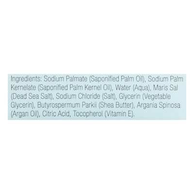 INGREDIENTS: Sodium Palmate (Saponified Palm Oil), Sodium Palm Kernelate (Saponified Palm Kernel Oil), Water (Aqua), Maris Sal (Dead Sea Salt), Sodium Chloride (Salt), Glycerin (Vegetable Glycerin), Butyrospermum Parkii (Shea Butter), Argania Spinosa (Argan Oil), Citric Acid, Tocopherol (Vitamin E).