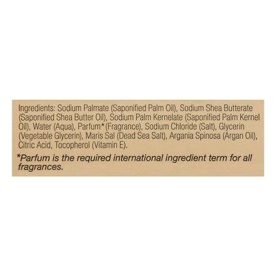 INGREDIENTS: Sodium Palmate (Saponified Palm Oil), Sodium Palm Kernelate (Saponified Palm Kernel Oil), Sodium Shea Butterate (Saponified Shea Butter Oil), Water (Aqua), Parfum (Parfum is the Required International Ingredient Term for All Fragrances, Our Fragrance is 100% Natural and Created from Essential Oils and a Variety of Sustainable Botanical Ingredients) (Fragrance), Sodium Chloride (Salt), Glycerin (Vegetable Glycerin), Maris Sal (Dead Sea Salt), Argania Spinosa (Argan Oil), Citric Acid, Tocopherol (Vitamin E).