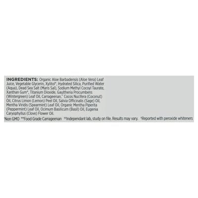 INGREDIENTS: Organic Aloe Barbadensis (Aloe Vera) Leaf Juice, Vegetable Glycerin, Xylitol (Non-GMO), Hydrated Silica, Purified Water (Aqua), Dead Sea Salt (Maris Sal), Sodium Methyl Cocoyl Taurate, Xanthan Gum (Non-GMO), Titanium Dioxide, Gaultheria Procumbens (Wintergreen) Leaf Oil, Carrageenan (Food Grade Carrageenan), Cocos Nucifera (Coconut) Oil, Citrus Limon (Lemon) Peel Oil, Salvia Officinalis (Sage) Oil, Mentha Viridis (Spearmint) Leaf Oil, Organic Mentha Piperita (Peppermint) Leaf Oil, Ocimum Basilicum (Basil) Oil, Eugenia Caryophyllus (Clove) Flower Oil.