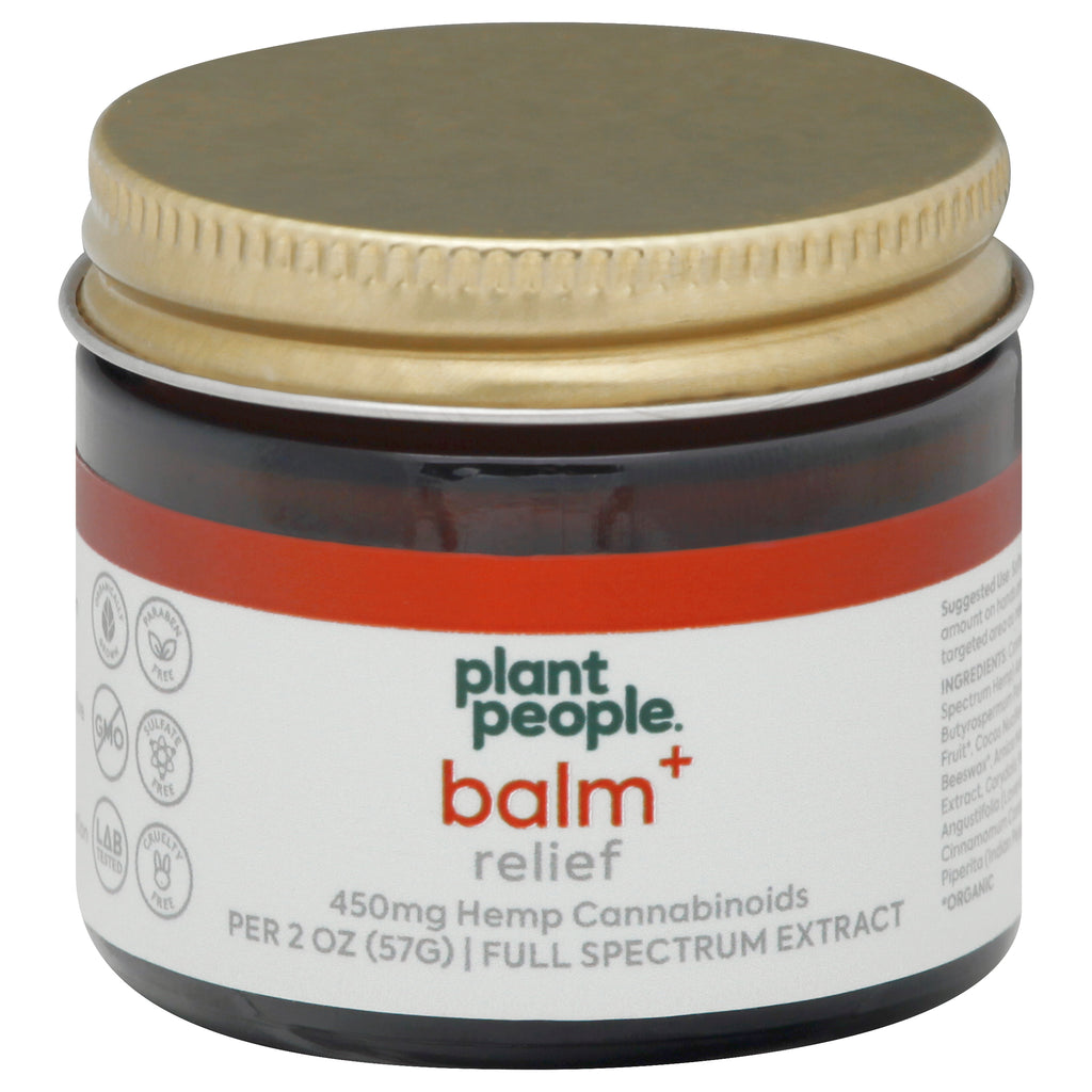 PRODUCT DETAILS: Organically grown. No GMO. 450 mg hemp cannabinoids per 2 oz (57 g). Full spectrum extract. Plants power people. Our Balm+ Relief is formulated with full spectrum hemp extract, including cannabinoids (such as CBD), and activating botanicals (arnica and corydalis), to support anybody looking for effective extra topical relief. Formulated for: tired muscles & joints; moderate inflammation; skin circulation; soothing cramps. Parabens free. Sulfate free. Lab tested. plantpeople.co. (at)plantpeople. Cruelty free. USA-produced.