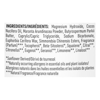 INGREDIENTS: Magnesium Hydroxide, Cocos Nucifera (Coconut) Oil, Maranta Arundinacea (Arrowroot) Powder, Butyrospermum Parkii (Shea) Butter, Caprylic/Capric Triglyceride (Fractioned Coconut Oil), Sodium Bicarbonate (Baking Soda), Euphorbia Cerifera (Candelilla) Wax, Simmondsia Chinensis (Jojoba) Esters, Citrus Aurantium Bergamia (Bergamot) Fruit Oil, Citrus Aurantifolia (Lime) Oil, Tocopherol (Vitamin E, Sunflower Derived), Beta-Sitosterol, Squalene.