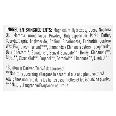 INGREDIENTS: Magnesium Hydroxide, Cocos Nucifera (Coconut) Oil, Maranta Arundinacea (Arrowroot) Powder, Butyrospermum Parkii (Shea) Butter, Caprylic/Capric Triglyceride (Fractionated Coconut Oil/Huile De Coco Fractionnee), Sodium Bicarbonate (Baking Soda/Bicarbonate De Soude), Euphorbia Cerifera (Candelilla) Wax, Parfum (Natural Fragrance/Fragrance Naturelle), Simmondsia Chinensis (Jojoba) Esters, Tocopherol (Vitamin E, Sunflower Derived/Derive De Tournesol), Beta-Sitosterol, Squalene.
