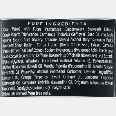 INGREDIENTS: Pure Ingredients: Aqua (Water) with Fucus Vesiculosus (Bladderwrack Seaweed) Extract, Caprylic/Capric Triglyceride, Carthamus Tinctorius (Safflower) Seed Oil, Vegetable Glycerin, Stearic Acid, Glyceryl Stearate, Stearyl Alcohol, Butyrospermum Parkii (Unrefined Shea) Butter, Coffea Arabica (Green Coffee Bean) Extract, Camellia Sinensis (Green Tea) Leaf Extract, Sodium Hyaluronate (Hyaluronic Acid), Theobroma Cacao (Cocoa) Seed Butter, Caffeine, Rosmarinus Officinalis (Rosemary) Leaf Extract, Ethylhexylglycerin, Allantoin, Tocopherol (Natural Vitamin E), Polysorbate-80, Aleurites Moluccana (Kukui) Oil, Mentha Piperita (Peppermint) Oil, Mentha Spicata (Spearmint) Oil, Phenethyl Alcohol, Panthenol, Carbomer, Lavender Angustifolia (Lavender) Oil, Orange Terpenes (Sweet Orange) Oil, Juniperus Virginiana (Cedarwood) Oil, Lavandula Hybrida (Lavandin) Oil, Origanum Marjorana (Sweet Marjoram) Oil, Eucalyptus Globulous (Eucalyptus) Oil.