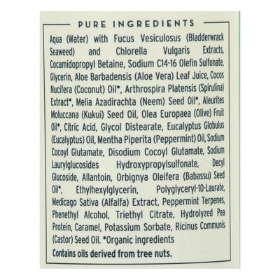 INGREDIENTS: Pure Ingredients: Aqua (Water) with Fucus Vesiculosus (Bladderwrack Seaweed) and Chlorella Vulgaris Extracts, Cocamidopropyl Betaine, Sodium C14-16 Olefin Sulfonate, Glycerin, Aloe Barbadensis (Aloe Vera) Leaf Juice, Cocos Nucifera (Coconut) Oil (Organic Ingredients), Arthrospira Platensis (Spirulina) Extract (Organic Ingredients), Melia Azadirachta (Neem) Seed Oil (Organic Ingredients), Aleurites Moluccana (Kukui) Seed Oil, Olea Europaea (Olive) Fruit Oil (Organic Ingredients), Citric Acid, Glycol Distearate, Eucalyptus Globulus (Eucalyptus) Oil, Mentha Piperita (Peppermint) Oil, Sodium Cocoyl Glutamate, Disodium Cocoyl Glutamate, Sodium Laurylglucosides Hydroxypropylsulfonate, Decyl Glucoside, Allantoin, Orbignya Oleifera (Babassu) Seed Oil (Organic Ingredients), Ethylhexylglycerin, Polyglyceryl-10-Laurate, Medicago Sativa (Alfalfa) Extract, Peppermint Terpenes, Phenethyl Alcohol, Triethyl Citrate, Hydrolyzed Pea Protein, Caramel, Potassium Sorbate, Ricinus Communis (Castor) Seed Oil.